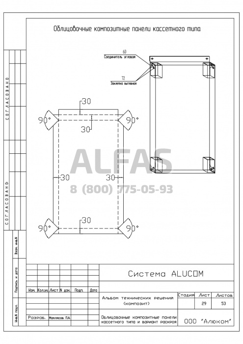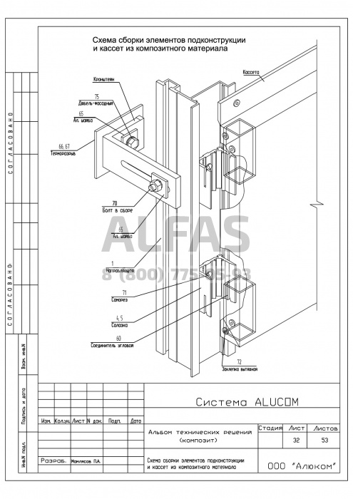 В системе Alucom KP крепление панелей облицовки осуществляется за счёт замка, образованного сочетанием скользящего кронштейна (салазки) и соединителя углового кассеты. При этом скользящие кронштейны (салазки) устанавливаются зеркально относительно друг друга, фиксируя облицовочную кассету в распор. Данный способ крепления обеспечивает высокую надёжность фиксации панели облицовки.