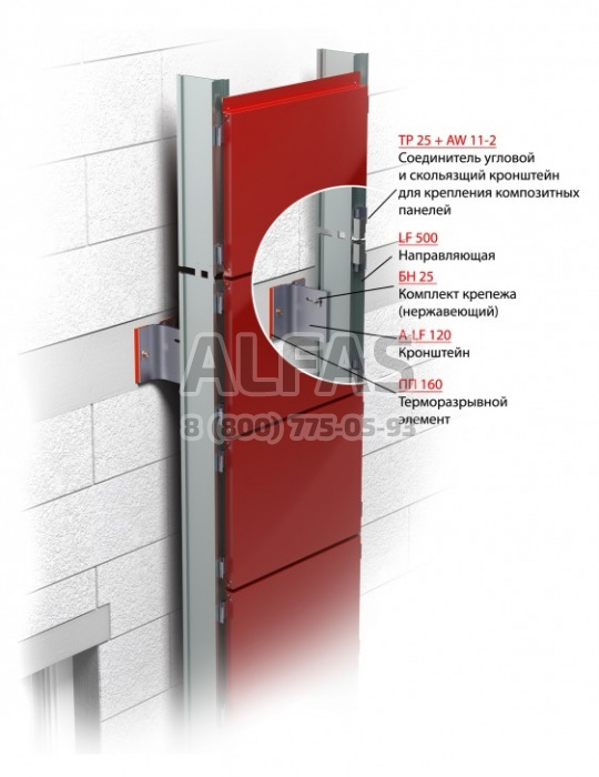 В системе Alucom LF 500 крепление панелей облицовки осуществляется за счёт замка, образованного сочетанием скользящего кронштейна (салазки) и соединителя углового кассеты. При этом скользящие кронштейны (салазки) устанавливаются зеркально относительно друг друга, фиксируя облицовочную кассету в распор.