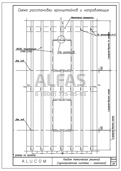 Alucom LF 500 – алюминиевая подоблицовочная конструкция, с креплением только в межэтажные перекрытия. Система разработана для зданий, на которых невозможно применение классической схемы крепления к несущим стенам, из-за низкой несущей способности стен (пенобетон, газосиликат, щелевой кирпич), а возможно лишь крепление в межэтажные железобетонные перекрытия.