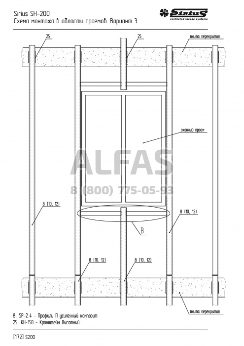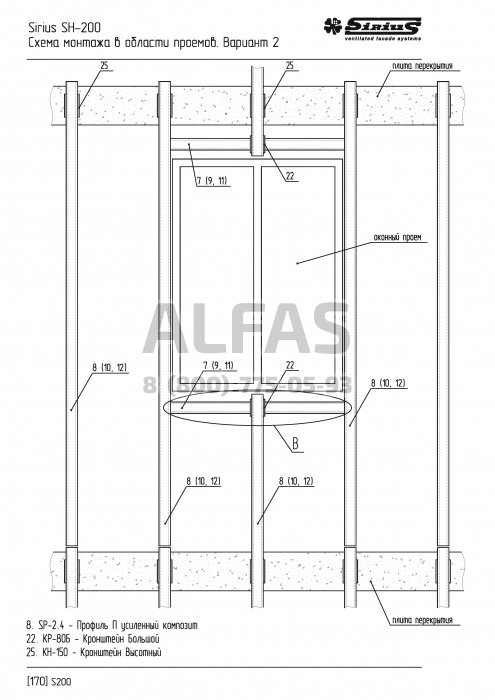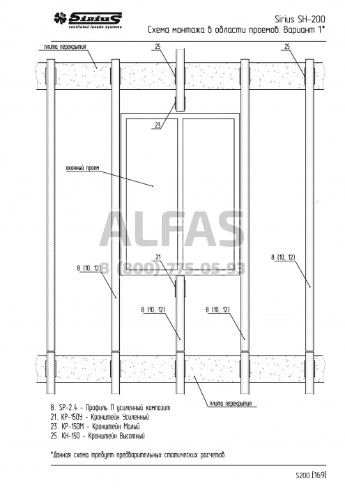 Система используется на зданиях , где материал межэтажного заполнения, а попросту говоря «стены» не выдерживают нагрузок Навесной Вентилируемой Системы. В таких случаях применение системы SH-200 будет оптимальным решением проблемы. Система крепится в межэтажные перекрытия, в креплении используются 4 анкера, что обеспечивает максимальную надежность конструкции.